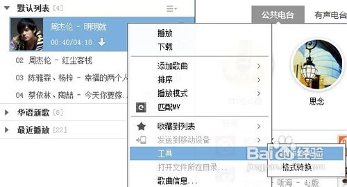 1、打開(kāi)酷狗音樂(lè)播放器,并將界面左側(cè)切換至播放列表頁(yè)面。之后在播放列表的任意一處單擊鼠標(biāo)右鍵,將鼠標(biāo)光標(biāo)懸停在右鍵菜單中的“工具”一欄上,之后使用鼠標(biāo)左鍵點(diǎn)擊子菜單中的“格式轉(zhuǎn)換”功能。