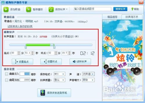歌曲添加完成后,即可進(jìn)行剪切了,其實(shí)操作非常簡(jiǎn)單,我們只需要將播放進(jìn)度條下面的“起始滑塊”和“結(jié)束滑塊”定位到想要剪切的位置;或者我們可以直接在下面的時(shí)間欄輸入相應(yīng)的起始時(shí)間和結(jié)束時(shí)間,再點(diǎn)擊“試聽(tīng)鈴聲”,試聽(tīng)下截取的片段是否滿意