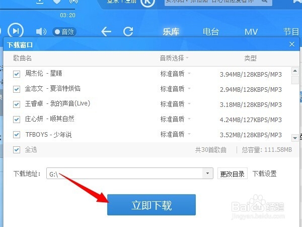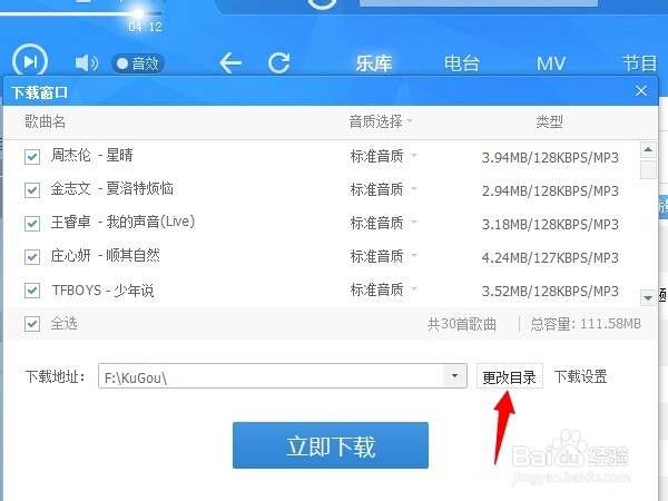 2、首先在打開(kāi)的下載設(shè)置窗口中,選擇想要下載的音樂(lè)文件的音質(zhì),音質(zhì)不同對(duì)應(yīng)的文件大小也不同。之后可以點(diǎn)擊“更改目錄”按鈕來(lái)修改下載后的文件的存放目錄。全部設(shè)置完成后,點(diǎn)擊中間的“立即下載”按鈕開(kāi)始下載。