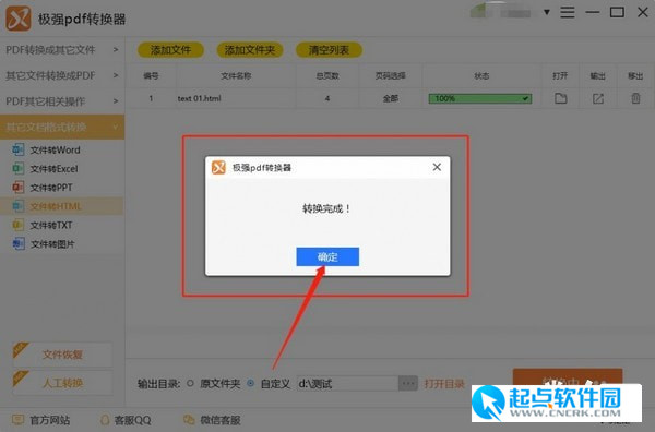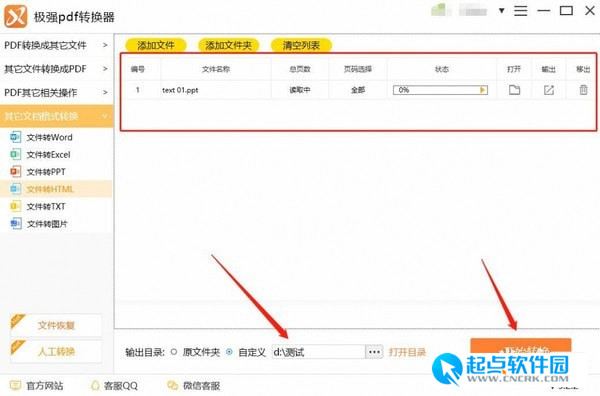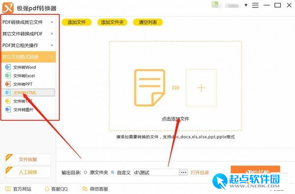如何把PDF文件轉(zhuǎn)換為html文件1、打開軟件主界面根據(jù)用戶需求選擇相應(yīng)的轉(zhuǎn)換功能“其他文檔轉(zhuǎn)換”中的“文件轉(zhuǎn)HTML”,然后點擊“添加文件”。