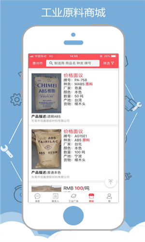 【工業(yè)社交】為工業(yè)上下游人脈搭建一個新的交友平臺。【原料商城】以O(shè)MO(線上融合線下)模式,提供塑料、金屬、添加劑等工業(yè)原料。讓買賣直接對接。