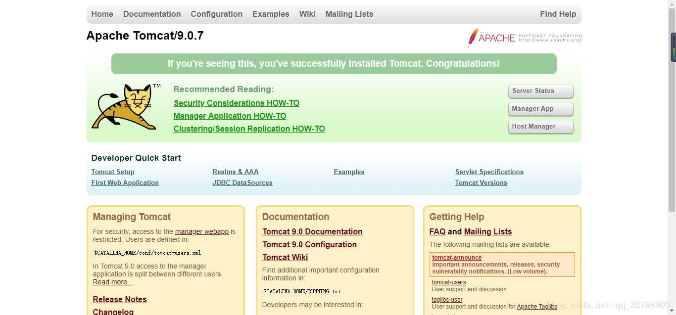 上面那個畫面不要關(guān)掉,在瀏覽器地址欄輸入http://localhost:8080/,出現(xiàn)下面這個畫面就證明配置成功。