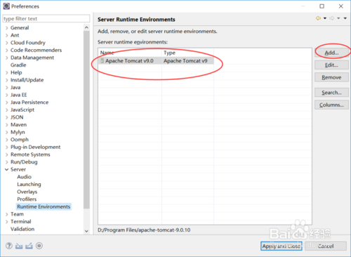 下圖是說明TOMCAT的配置方法,也是只有兩步,方法與JDK的方法是一樣的。找到D盤的路徑,然后是名字的設(shè)置,都是不能錯的。保存自己的配置,TOMCAT就完成了配置。