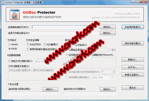 優(yōu)道文檔保護(hù)器UUdoc Protector是一款對文檔和圖片進(jìn)行加密保護(hù)的轉(zhuǎn)換工具,軟件支持對Office文檔、PDF、XPS、圖片等進(jìn)行加密保護(hù),允許設(shè)置過期時(shí)間和次數(shù)限制,支持密碼、機(jī)器碼和Email等多種身份驗(yàn)證,支持將各種文檔直接編譯成exe可執(zhí)行文件,新版本中使用了最新的防截圖引擎,性能更好,支持64位防截圖。