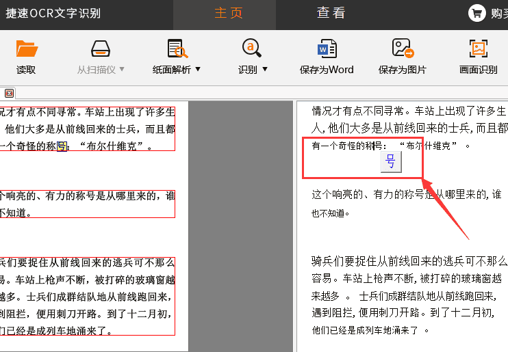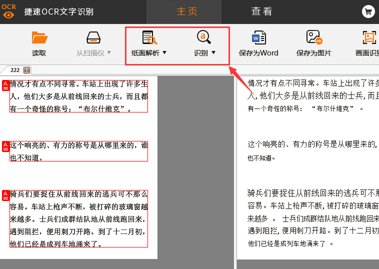 第四步,我們點擊“紙面解析”,可對不同短路的文字進(jìn)行解析,然后再點擊“識別”選項,即可將左邊圖片的文字識別在軟件右側(cè)。