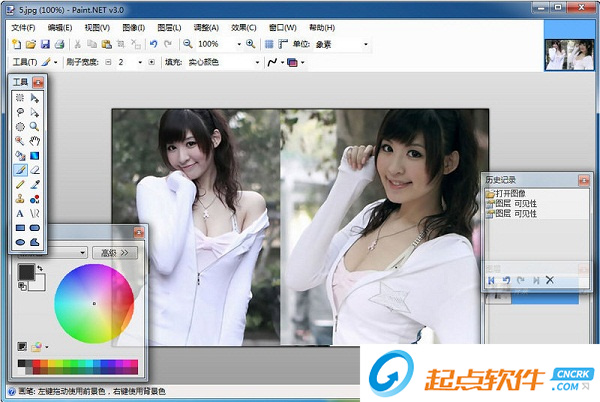 1.Paint. NET工具面板與PS的感覺(jué)比較一致,其基本功能如選取、移動(dòng)、魔棒、文字、色彩吸管、克隆、畫(huà)筆、橡皮、顏色替換、刷子、直線、矩形、橢圓等共20項(xiàng)。就數(shù)量和各工具的調(diào)整參數(shù)而言,與PS差距不小,不過(guò)滿足日常的基本應(yīng)用應(yīng)該沒(méi)有問(wèn)題。2.在Paint. NET中,各項(xiàng)工具的使用方法與PS基本保持一致,比如克隆工具,均采用Ctrl+鼠標(biāo)左鍵定義“源”,并使用鼠標(biāo)左鍵進(jìn)行克隆。