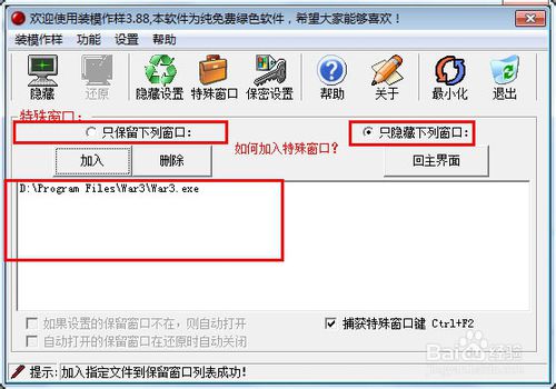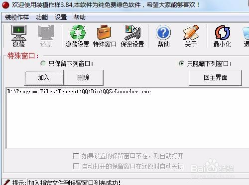 下一個特殊窗口便是我們最關(guān)心的問題了,想隱藏那個或者想保留哪幾個都在這里面設(shè)置,以隱藏QQ軟件為例,選擇只隱藏下列窗口,加入QQ的安裝路徑里面的啟動程序,就OK啦