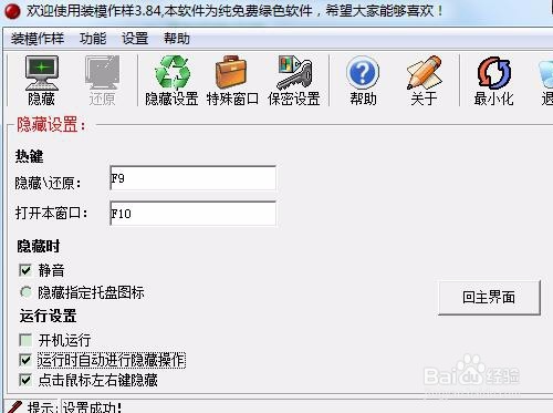 隱藏設(shè)置里設(shè)置一下隱藏熱鍵和呼出熱鍵,包括靜音,運行時自動隱藏等選項,下面的隱藏制定托盤圖標選擇需要隱藏的
