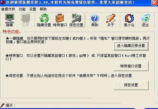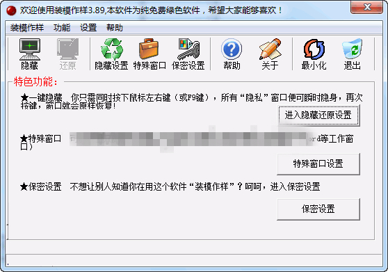 裝模作樣軟件是一款窗口隱藏工具,正在上網(wǎng)聊天玩游戲,老板進來了?正在瀏覽“隱私”文件,突然一位不速之客來找你?只需同時按下鼠標左右鍵(或F9鍵)就可以瞬間隱藏所有的隱私窗口,而只保留(或調(diào)出)你設(shè)定好的軟件(文件)。再次按下F9鍵,窗口就會原樣恢復(fù),工作狀態(tài)與游戲狀態(tài)瞬間轉(zhuǎn)化。軟件功能強大,在隱藏時可以選擇靜音,隱藏托盤圖標等功能,自由設(shè)定公開窗口,此外還可以隱藏程序自身及托盤圖標以防止別人發(fā)現(xiàn)自己安裝了本軟件。