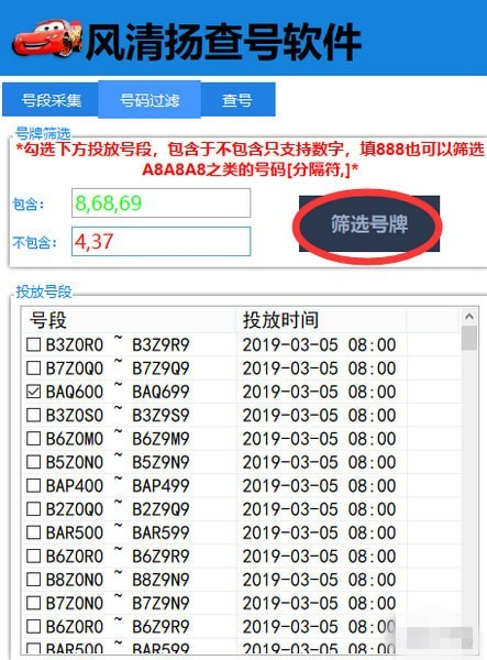 10,切換到號碼過濾欄目,根據(jù)需求設(shè)置包含與不包含關(guān)系,然后在要查詢的號段前面勾選,單擊篩選號牌。
