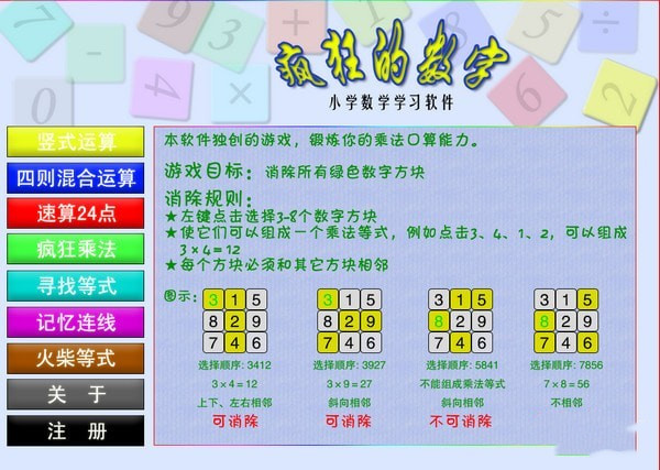 1、瘋狂乘法:本軟件獨(dú)創(chuàng)數(shù)學(xué)游戲,鍛煉你的乘法口算能力。游戲目標(biāo):消除所有綠色數(shù)字方塊。消除規(guī)則:選擇3-8個(gè)數(shù)字方塊,如果它們滿足兩個(gè)條件,這些方塊就會(huì)被消除。1、它們可以組成一個(gè)乘法等式;2、每個(gè)方塊必須和其它方塊相鄰。通過(guò)這個(gè)游戲,你的乘法口訣一定會(huì)滾瓜爛熟的。