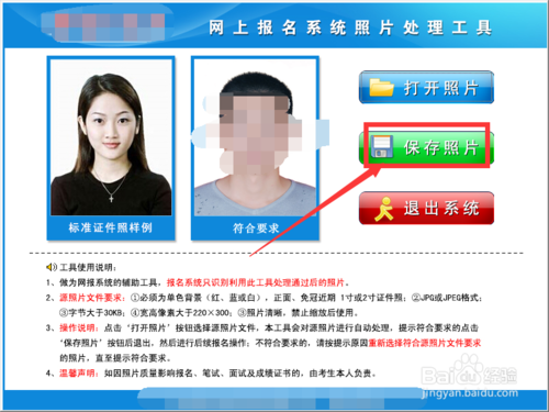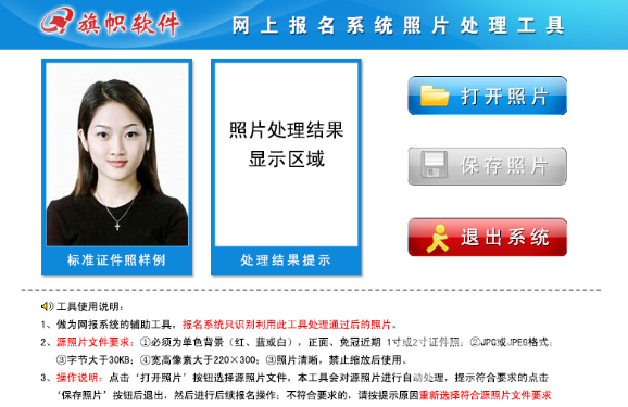 3、操作說明:點擊‘打開照片’按鈕選擇源照片文件,本工具會對源照片進行自動處理,提示符合要求的點擊‘保存照片’按鈕后退出,然后進行后續(xù)報名操作;不符合要求的,請按提示原因重新選擇符合源照片文件要求的照片,直至提示符合要求。