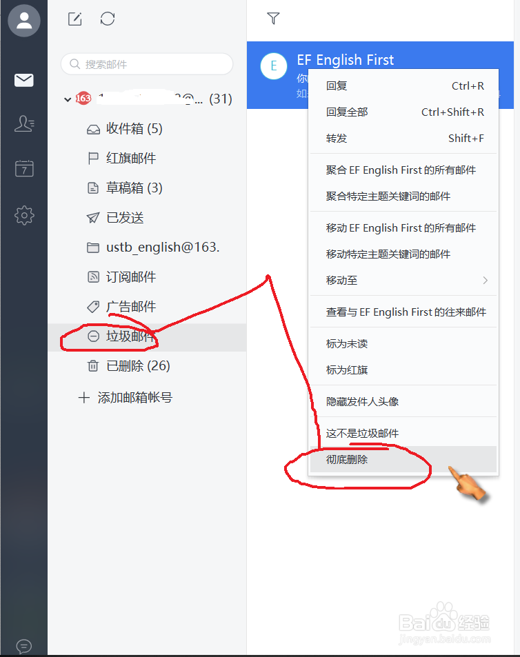 點(diǎn)擊“垃圾郵件”,右鍵點(diǎn)擊單個(gè)垃圾郵件,選擇徹底刪除即可將垃圾郵件徹底刪除。