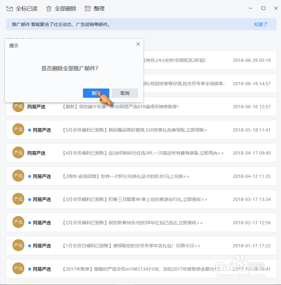點(diǎn)擊右上角“全部刪除”,點(diǎn)擊確定,即可刪除全部推廣郵件。