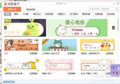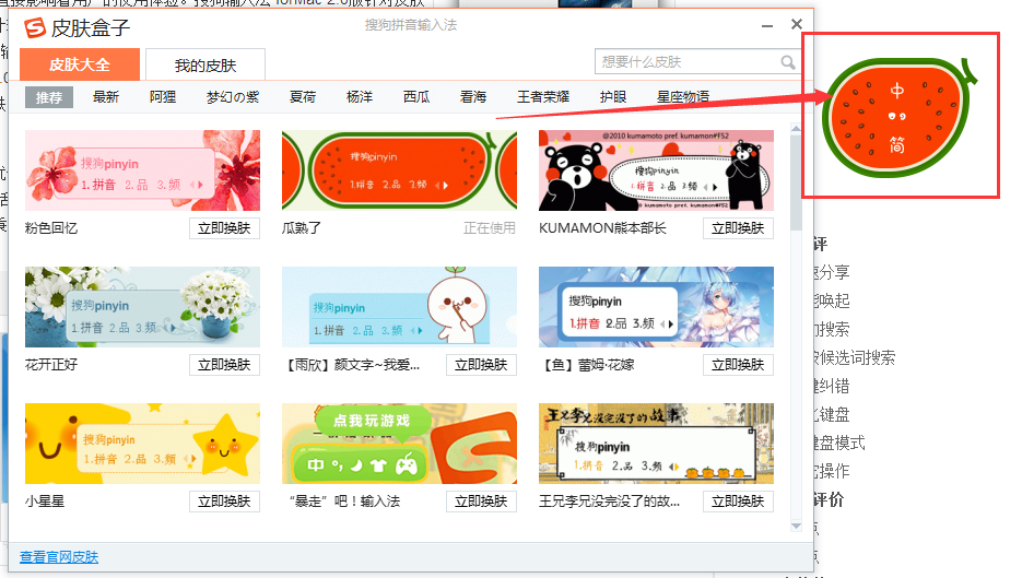 4、個性輸入:用戶可以選擇多種精彩皮膚,更有每天自動更換一款的<;;皮膚系列>;;功能。最新版本按“i”鍵可開啟快速換膚。