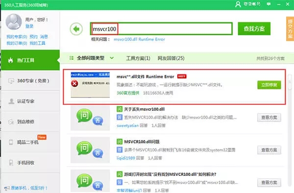 1、使用360安全衛(wèi)士里的人工服務(wù),在搜索框里輸入msvcr100.dll,點擊查找方案;