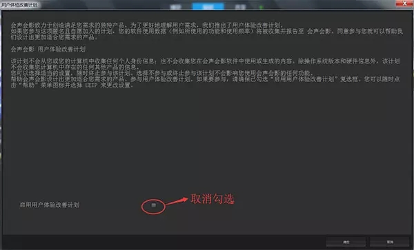 打開會聲會影視頻編輯軟件,依次選擇“幫助-用戶體驗改善計劃”,把參加用戶體驗改善計劃取消勾選即可。