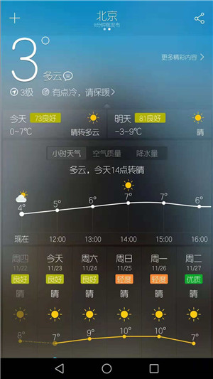 3、操作方便:上下滑動的操作方式,可更快速更便捷的查看天氣趨勢、風速、生活指數(shù)等信息。