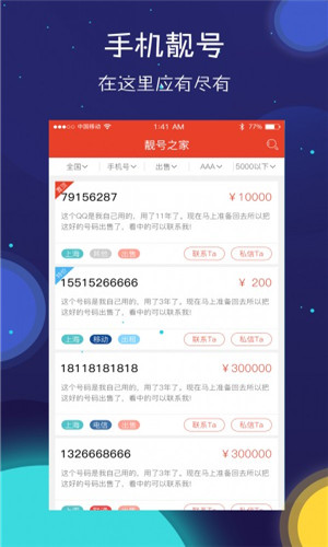 靚號(hào)之家是一款關(guān)于手機(jī)號(hào)、車牌號(hào)、固定電話號(hào)碼等一些信息發(fā)布平臺(tái),靚號(hào)之家app可以在首頁找到你想要的手機(jī)號(hào),車牌號(hào),固定電話號(hào)碼,并且可以直接與發(fā)布者電話聯(lián)系或者通過app內(nèi)聊天的方式與發(fā)布者取得聯(lián)系。我要抵押頁面是幫助一些急需要資金支持的用戶,通過用戶的填寫一些相關(guān)的信息并提交成功,我們會(huì)有專業(yè)人士和用戶立即時(shí)間聯(lián)系。