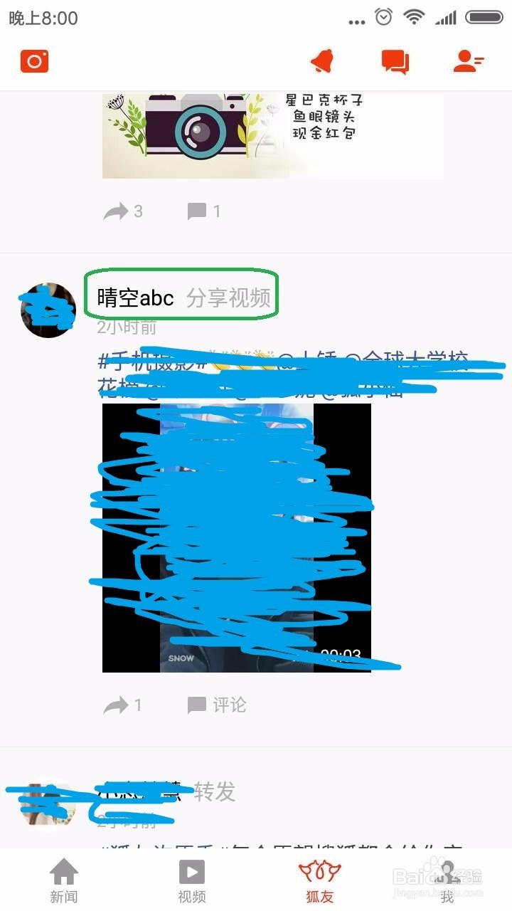 返回到狐友首頁,在朋友圈中可以看到”晴空abc”的分享消息