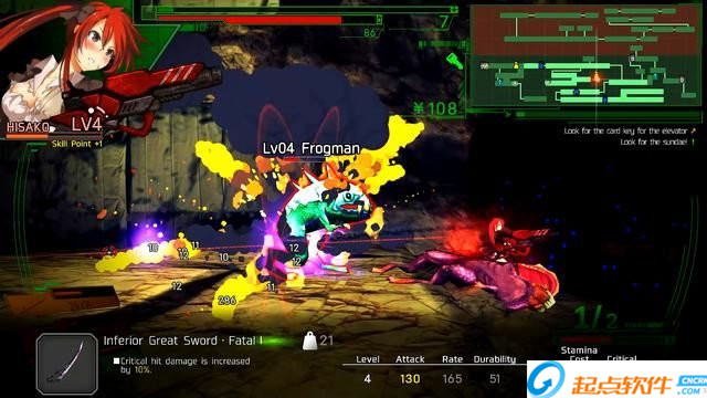 前面儲存點學(xué)會強(qiáng)化武士刀(黃色零件),給武器刀增加附加屬性(紫色配件)。
