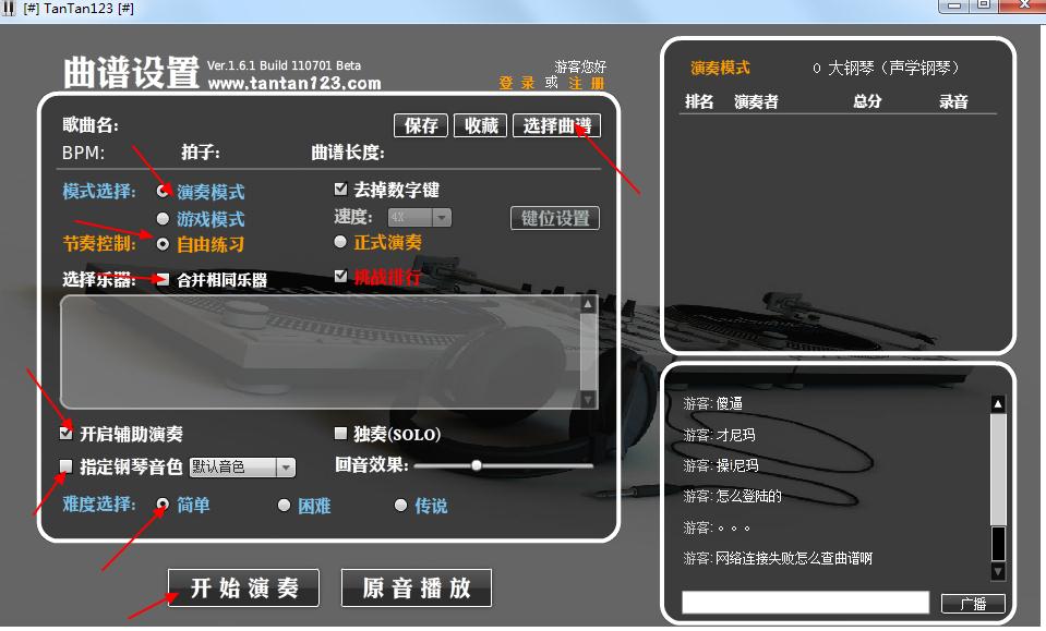 注意:如果要記錄得分和排行,需要演奏前在網(wǎng)站首頁登錄。登錄之后新打開的曲譜,在網(wǎng)頁和客戶端中演奏都可以記錄得分、挑戰(zhàn)排行了。