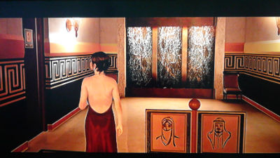 隨意走動(dòng),走進(jìn)一個(gè)有假瀑布?jí)吷系膸?,然后到最后一個(gè)坑位里,坐上馬桶打開手提包拿出筆記本(這里所有操作都是由右搖桿完成)“艾登,艾登你準(zhǔn)備好了嗎?”朱迪自言自語(yǔ)道“樓上的房間里有一張很大的畫,保險(xiǎn)箱就在它后面,我們要的文件就在里面,不過那里有很多攝像機(jī),你必須小心行事,知道了嗎?”