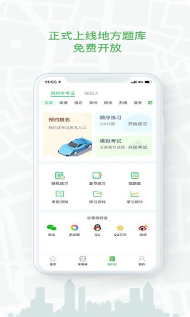 2.可在福利社-網(wǎng)約考證板塊完成網(wǎng)約車考證練習(xí)及報(bào)名考試。
