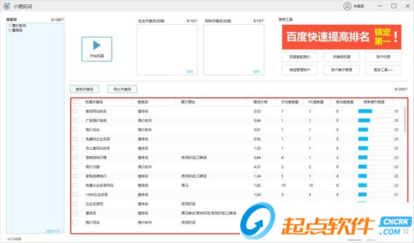 拓詞成功:拓詞結(jié)果直接展示在下方列表中,同時展示拓展關(guān)鍵詞的展現(xiàn)理由、最低價格、日均搜索量、PC搜索量、移動搜索量、競爭激烈程度數(shù)據(jù),支持排序篩選方便快速找到高質(zhì)量的關(guān)鍵詞。