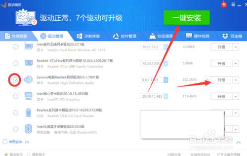 3、如果沒(méi)有聲卡驅(qū)動(dòng)的話系統(tǒng)會(huì)提示缺少未安裝的驅(qū)動(dòng),我的電腦上已經(jīng)安裝了,提示的可升級(jí),如圖所示。點(diǎn)擊勾選可以進(jìn)行升級(jí)。