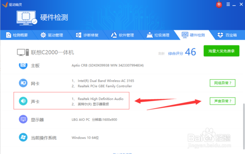 3、檢查結(jié)果幾分鐘就出來(lái)了,然后可以查看電腦的網(wǎng)卡、聲卡、顯卡驅(qū)動(dòng)問(wèn)題,點(diǎn)擊查看需要更新的驅(qū)動(dòng)。