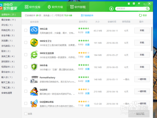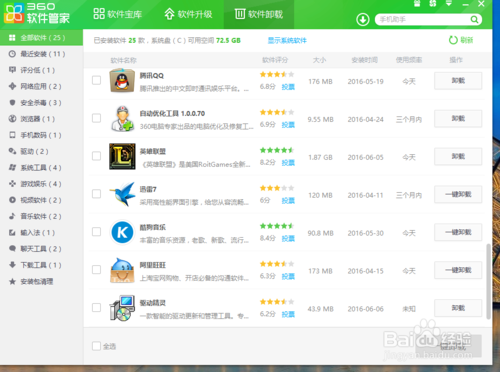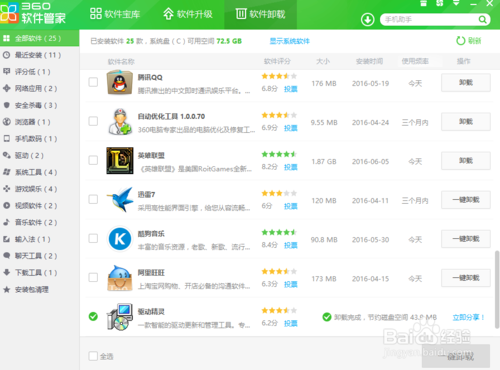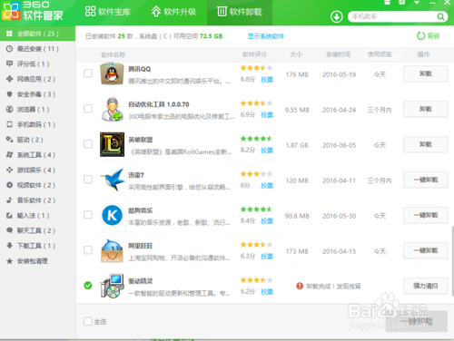 4、然后我們打開360軟件管家,點(diǎn)擊“軟件卸載”在找到驅(qū)動(dòng)精靈的軟件,在右邊點(diǎn)擊“卸載”如圖;