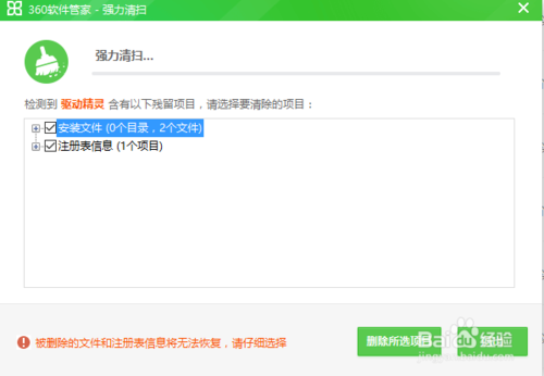 6、最后在返回到軟件卸載。點(diǎn)擊“強(qiáng)力清掃”會(huì)彈出一個(gè)小框框,在安裝文件和注冊(cè)表信息左邊旁邊的小框框上打鉤,在點(diǎn)擊“刪除所有項(xiàng)目”,這樣驅(qū)動(dòng)精靈就卸載了。