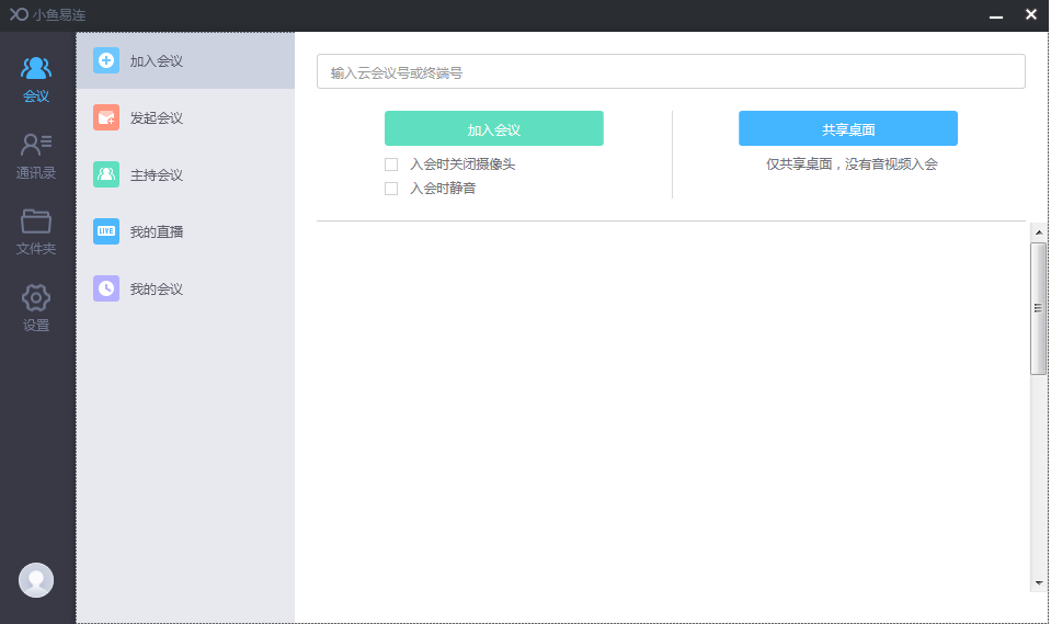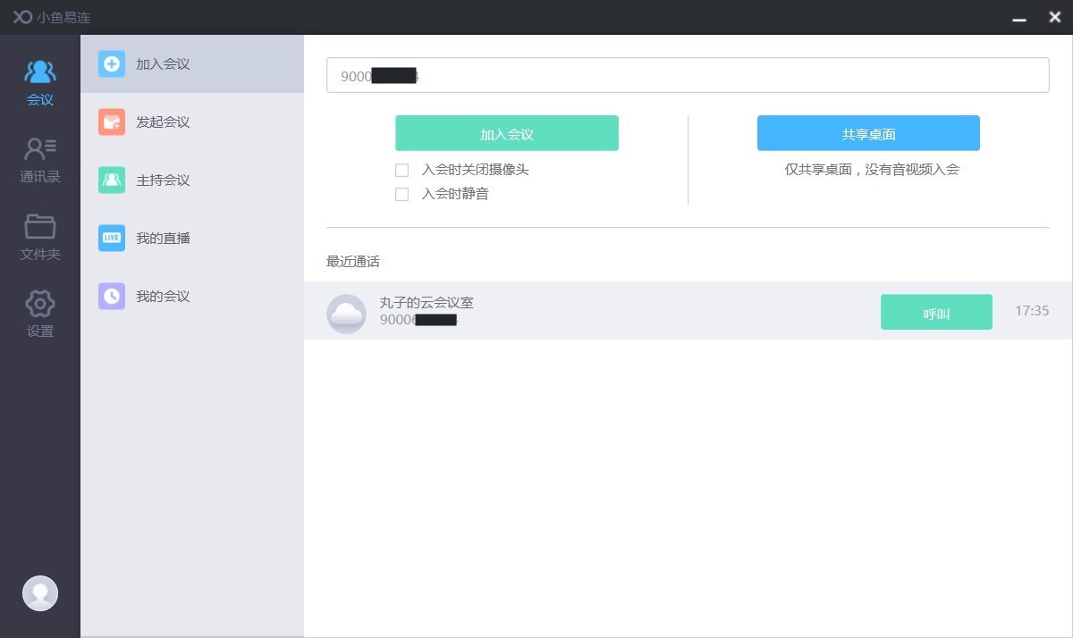 點(diǎn)擊“會議”--“加入會議”,在右側(cè)界面的文本輸入框中,輸入本地小魚終端號碼或云會議號碼,點(diǎn)擊“共享屏幕”,即可開始共享。