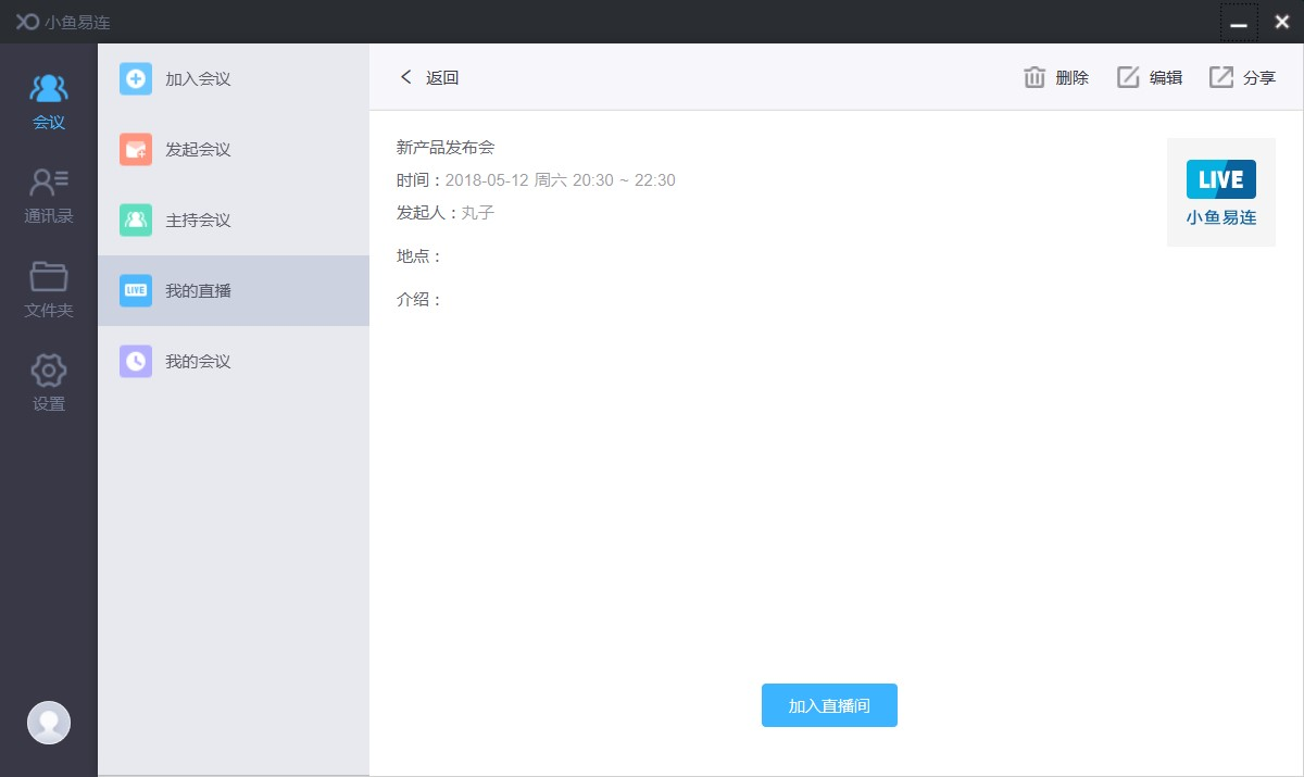 點(diǎn)擊列表中的右箭頭,即可進(jìn)入詳情頁面,可以直播編輯、分享、刪除操作,點(diǎn)擊“加入直播間”,即可在彈出的直播窗口中進(jìn)行“開始直播”、“主持直播”等操作。