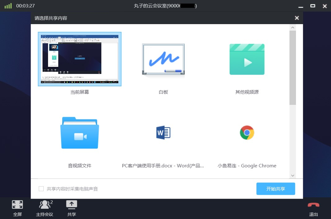 2、PC客戶端加入某個(gè)會議,在視頻通話過程中,點(diǎn)擊工具欄按鈕進(jìn)行共享內(nèi)容。主要用于用戶本地沒有其他小魚設(shè)備或客戶端,只可通過PC客戶端加入視頻會議,并同時(shí)共享內(nèi)容。