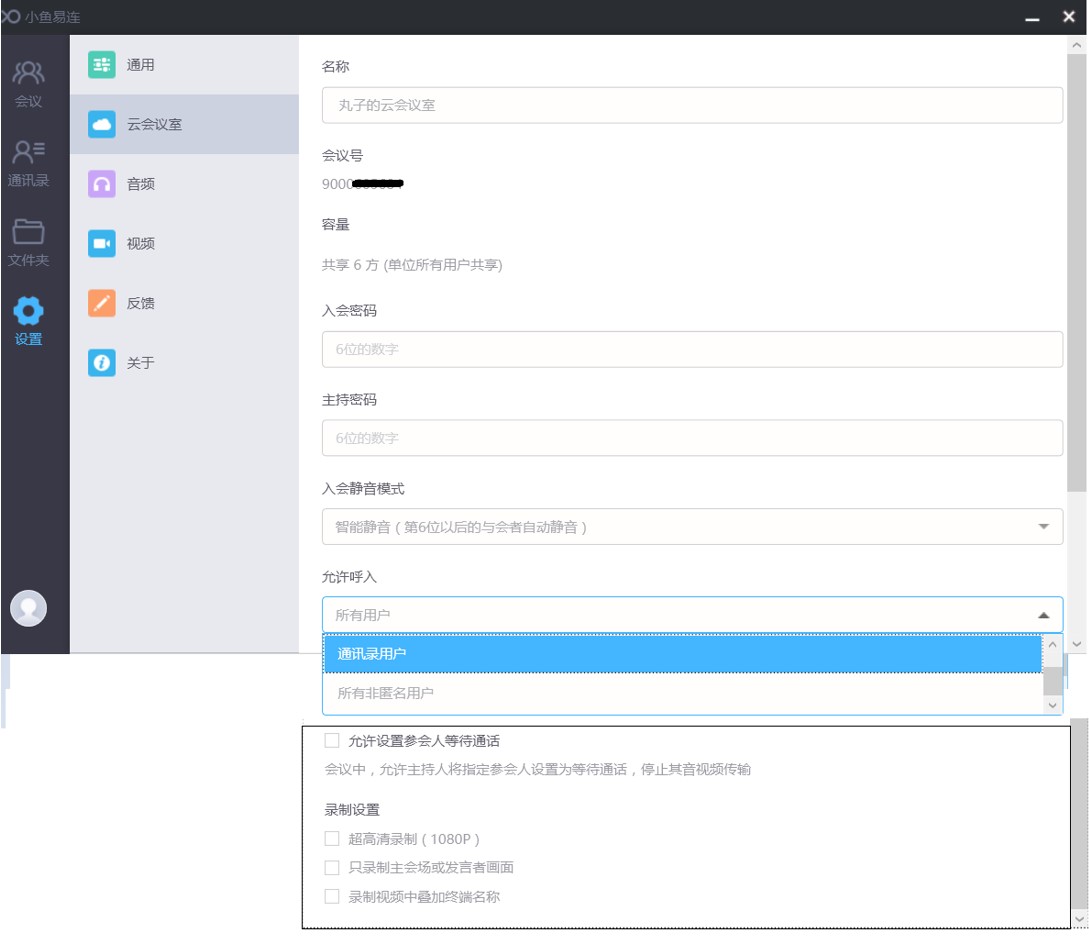 3.云會議室支持設(shè)置允許呼入范圍,支持僅允許企業(yè)通訊錄用戶呼叫。