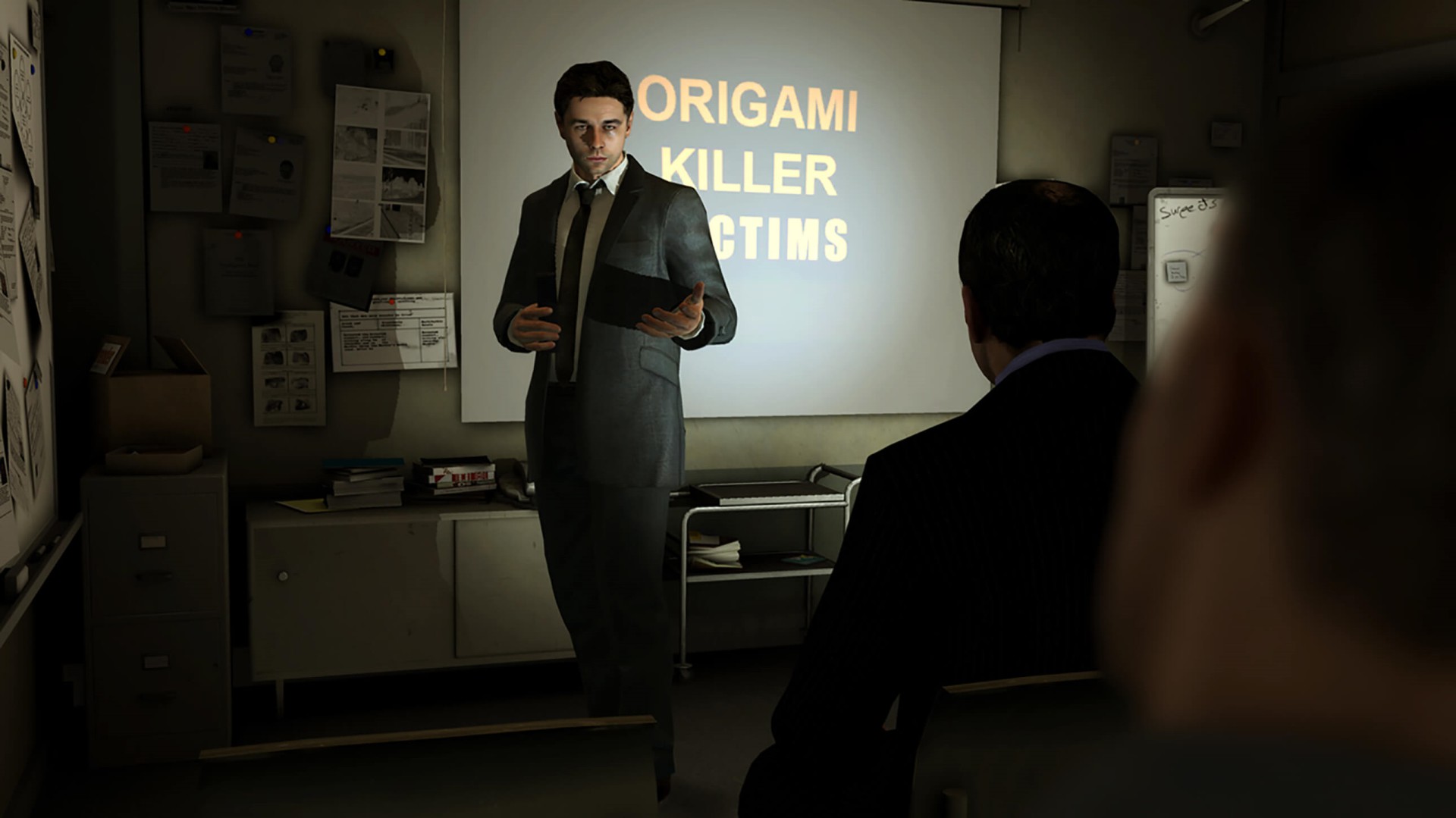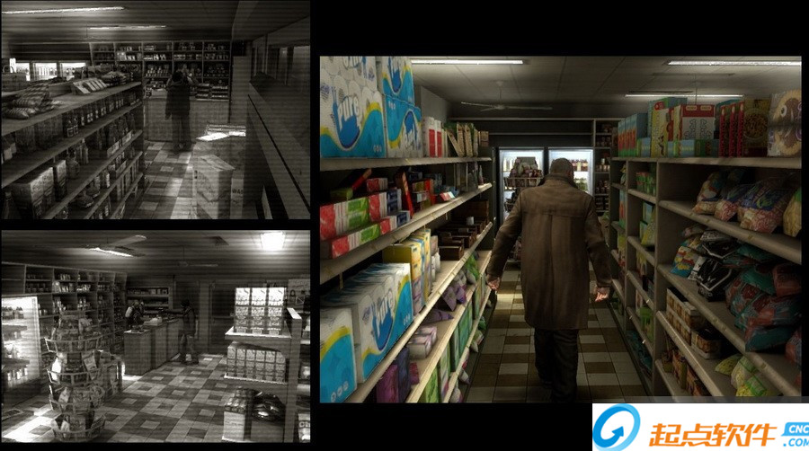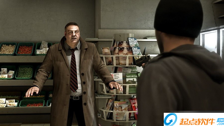 偵探史考特跑到另一個受害者處調查情況,這位父親是開便利店的哈森,他對史考特的到訪反應極為冷淡,不管怎么勸說他都不愿多說什么。史考特去內側的貨架上拿吸入器,此時進來個鬼鬼祟祟的年輕男子,他突然掏出手槍威逼哈森把錢交出來。強盜并沒有發(fā)現史考特,此時偵探先生有多種選擇,一種是拿起酒瓶,慢慢接近,最后把強盜打暈。如果靠近過程中發(fā)出響動而被發(fā)現,那么就會進入交涉狀態(tài),史考特會發(fā)揮他談判專家的特長。這里有兩種情況,一種是把強盜說動了,他會逃走,一種是沒把強盜說服,他就會和史考特扭打起來,幾下QTE就能把他制服。打暈、制服歹徒或是說服歹徒離開,最后的結果都一樣,那就是哈森為表示感謝,交給史考特一個裝著折紙的鞋盒子。還有一種情況,第一次游戲時玩家不太可能這樣選擇,請看“特別提示”中的提示。