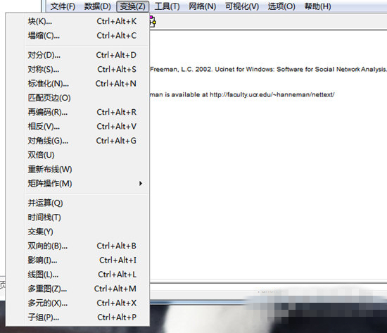 ucinet中文版是一款非常好用的社會網(wǎng)絡(luò)數(shù)據(jù)分析軟件,它的支持工具菜單可以找到MDS、簇、2??s放比例、一致性分析、相似、不同距離、單變數(shù)統(tǒng)計(jì)、計(jì)數(shù)組合、頻率、假設(shè)檢驗(yàn)、矩陣代數(shù)學(xué)等功能,從而幫助用戶更好分析數(shù)據(jù)!