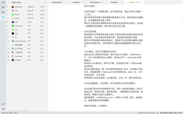 您在最 右側(cè)編輯框編輯文檔的時候,章節(jié)界面會自動識別您文檔中出現(xiàn)的'第一章'之類的字眼,自動顯示在成一個列表,并顯示對應(yīng)字數(shù)。這個自動的。當(dāng)您要跳轉(zhuǎn)到對應(yīng)位置的時候,點擊章節(jié)上章節(jié)名,就會自動跳轉(zhuǎn)到對應(yīng)位置。當(dāng)您的文檔有數(shù)個以及更多的時候,這個功能相當(dāng)有用。