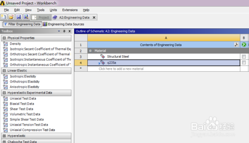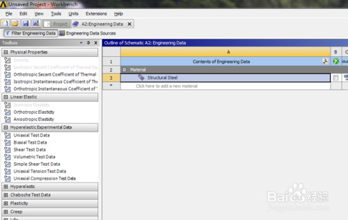接著在工程A中雙擊工程數(shù)據(jù),Engineering Data,進(jìn)去后可看到系統(tǒng)默認(rèn)的材料屬性為結(jié)構(gòu)鋼。