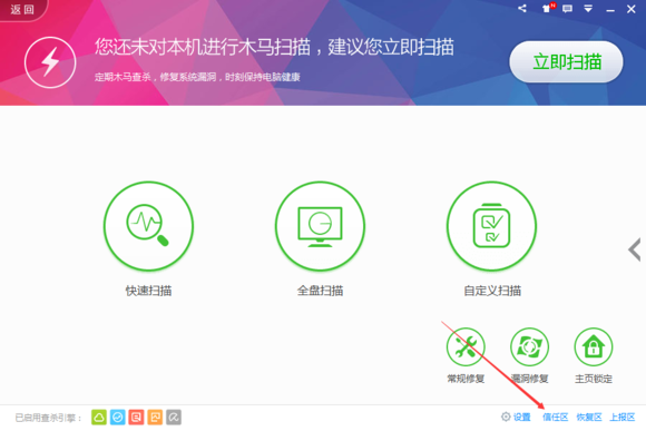 首先打360衛(wèi)士,點(diǎn)擊查殺修復(fù)然后點(diǎn)擊信任區(qū)