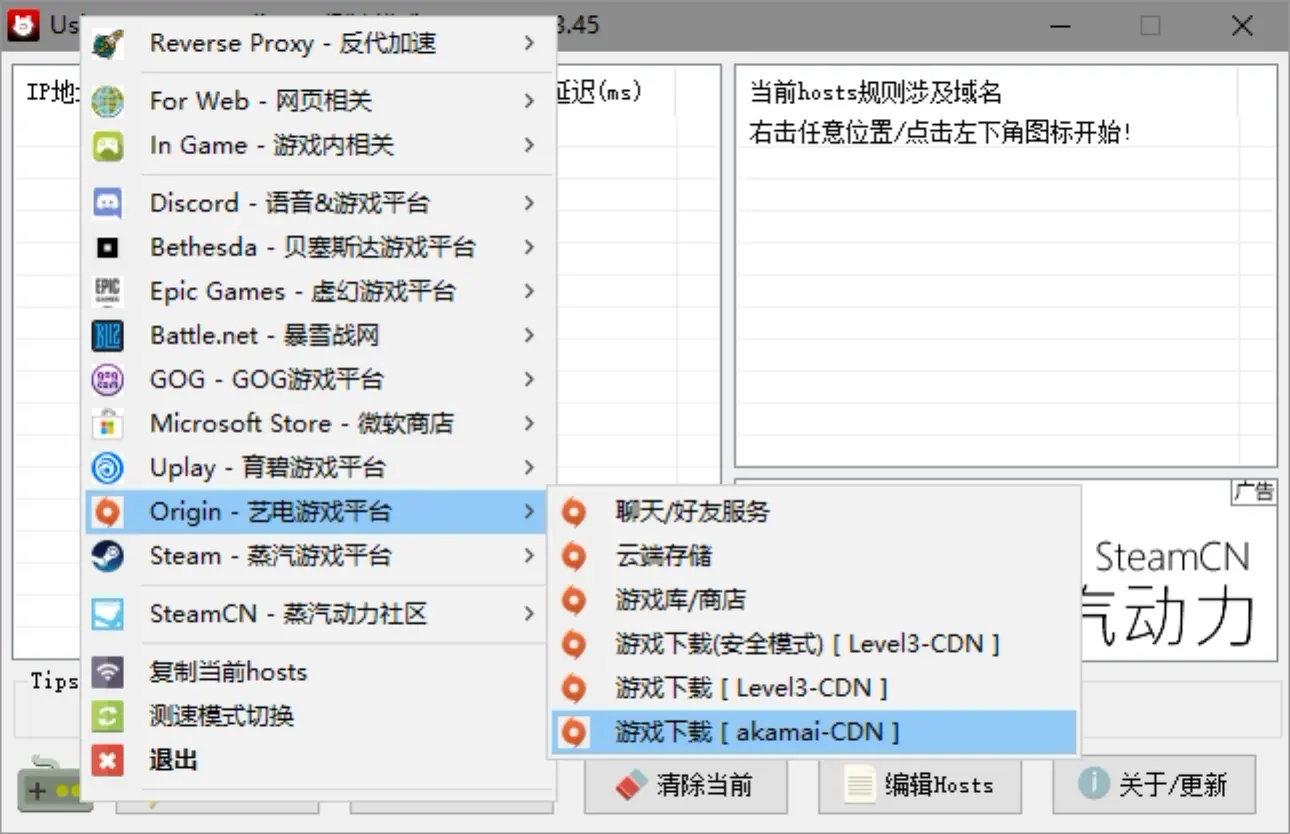下圖包括了許多片的功能,包括了復(fù)制當(dāng)前的Hosts、測(cè)速模式切換、擁有許多的游戲選項(xiàng)等;