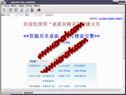 桌面灰精靈是一款網站優(yōu)化推廣、日常工具、休閑娛樂等使用多個領域的工具。