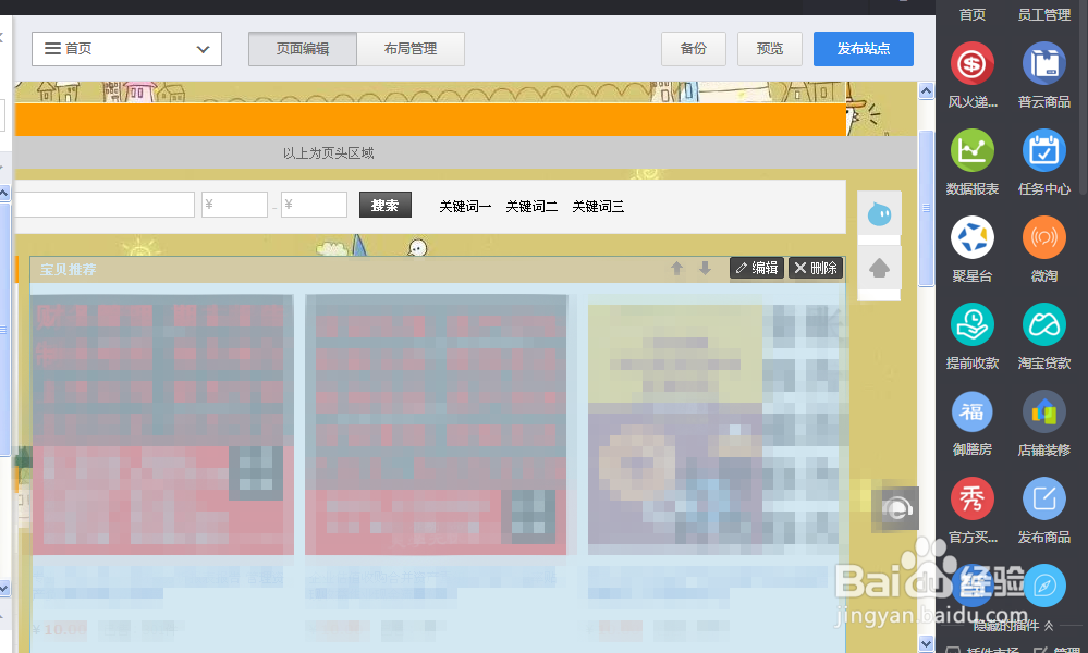 設置好以后,返回【頁面編輯】界面(如步驟4),開始設置具體的寶貝內容。打開【寶貝推薦】,選擇【編輯】。