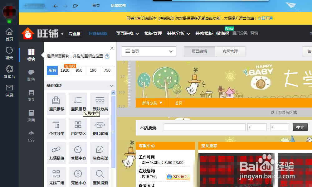 在左側選擇模塊,設置自己喜歡模塊的大小和寬度,1920代表屏幕寬,950是在頁面中間的大模塊,和頁頭的logo一樣寬度,750是在右側的【寶貝推薦】寬度模塊,190是左側的【客服中心】寬度模塊。