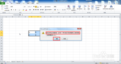 11、合并單元格時,只能保留第一個小單元格的數(shù)據(jù),在彈出的對話框中,點擊確定按鈕,如圖所示: