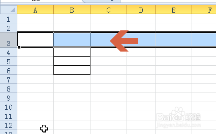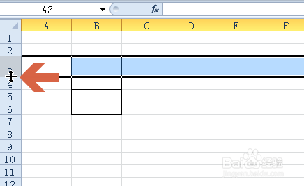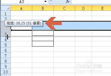 6、如果想快速設(shè)置行高,對行高值要求不太精確??梢詫⑹髽?biāo)指針指向行號的交界處,當(dāng)鼠標(biāo)指針變成圖中所示形狀后,按住鼠標(biāo)左鍵不放,同時上下拖動鼠標(biāo)。
