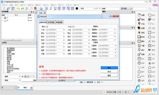 12、梗概自動(dòng)生成:只要在“文件”中選擇“更換模板”,然后打開“梗概自動(dòng)生成模板”,再點(diǎn)擊“工具-自動(dòng)生成”,馬上就可自動(dòng)生成一篇一千字的梗概,在此基礎(chǔ)上進(jìn)行修改,豈不快哉!