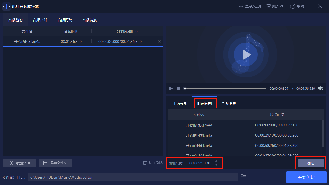 這是一個(gè)能將完整的音頻根據(jù)用戶的需求進(jìn)行剪輯切割的功能,只需要添加音頻文件后,在編輯欄中設(shè)置好分割時(shí)間點(diǎn),就可以開始剪切了。